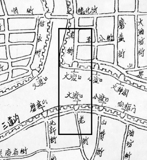 王羡荣说:“大渡口码头是周家口开辟的第一个渡口。如今立大渡口码头遗址碑,是为了让后人了解周家口的起源,是非常必要的,但碑应该立在老街对面的河堤处。”为了证实自己的说法,王羡荣查阅了1986年3月出版的《周口文史资料》 第二辑,找到两张1935年前周家口的地图,其中一张周家口沿河渡口示意图标明沙颍河南岸小渡口对着山货街,大渡口对着老街,磨盘山渡口对着北新街(如图)。后来,由于多次修筑河堤,那里只留下新街北头的磨盘山码头,大渡口码头已看不到遗迹。