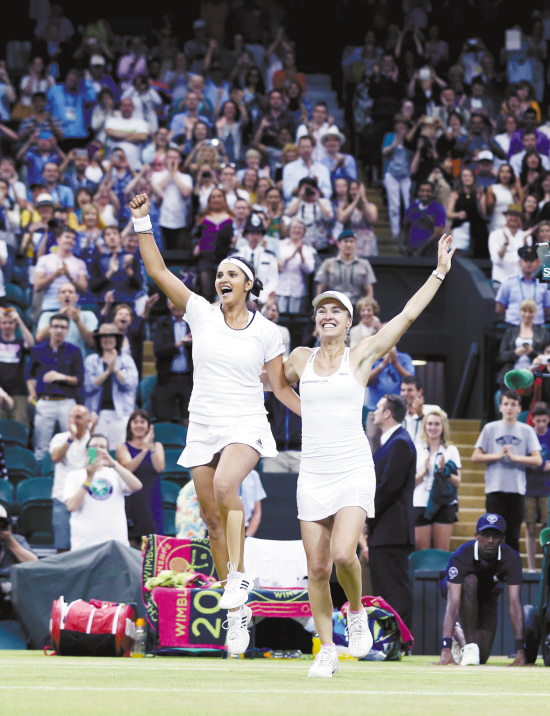 瑞士选手辛吉斯(右)与印度选手米尔扎在获胜后庆祝 温布尔登网球公开赛女双决赛 瑞士名将辛吉斯 时隔17年再度夺冠 据新华社电 瑞士名将辛吉斯当地时间7月11日在温布尔登公开赛女双决赛中,与印度选手米尔扎搭档赢得女双冠军,时隔17年后再次在温网夺冠。 34岁的辛吉斯曾经在1997年赢得温网女单冠军,还在1996年和1998年两次获得女双的胜利。