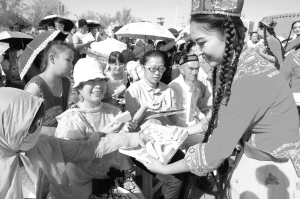 7月20日,游客在第十二届新疆哈密瓜节上品尝哈密瓜。