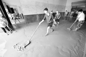 7月23日,福建省连城县朋口镇居民在帮忙清理一家米厂屋内的淤泥。