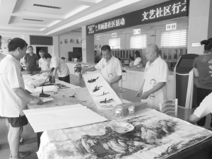 7月28日上午,川汇区文联的8名书画志愿者走进该区荷花路办事处前王营社区,开展“送书画进社区”活动。他们在现场挥毫泼墨,为前王营社区创作了30多幅作品。