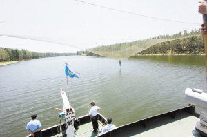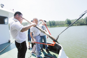 7月30日,记者跟随市公安、水利、交通等部门,从周口港乘船沿航道一路向东,一一清除沿途航道内的过河渔网。在此次航道清除渔网的行动中,记者看到在航道内存在着大量的过河渔网,执法人员用手动夹持钢索剪将串联在过河渔网上的钢索剪断,使渔网沉入河底,避免渔网缠绕船舶发动机的事故发生(如右图)。
