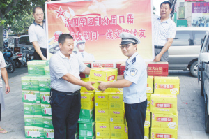 7月31日上午,十多名沈阳军区退伍老兵代表来到周口市区中州大道与七一路交叉口,看望在一线执勤的交警,为他们送去饮料、矿泉水、风油精等物品。退伍老兵张中营说:“虽然我们已经退伍很多年,但我们仍是军人。在八一建军节时,我们特地看望执勤的交警并送上礼物。这么热的天,他们真是太辛苦了。” 晚报记者 朱东一 摄