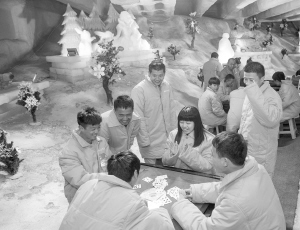 近日,重庆市连晴高温,多地气温突破35℃。为了避暑休闲,重庆美心洋人街景区“冰雪童话”景点里搭起了牌桌,吸引不少游客前来。据悉,“冰雪童话”景点面积2500平方米,由500吨冰块堆砌而成。新华社记者 陈诚 摄