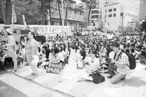 8月12日,韩国民众在位于首尔的日本驻韩大使馆前举行示威活动,强烈要求日本首相安倍承认侵略历史。