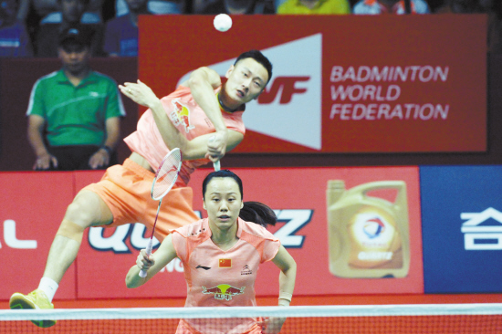 张楠/赵芸蕾(前)获混双冠军 据新华社电 中国组合张楠/赵芸蕾在当地时间8月16日举行的2015年世界羽毛球锦标赛混双决赛中夺得冠军。 混双决赛是世锦赛决赛日的首场比赛。赛前,中国“羽林争霸”全国总冠军株洲兴明液压队为本届羽毛球世锦赛决赛进行了开球仪式。 当天的混双决赛在两对中国组合之间展开。张楠/赵芸蕾以21∶17、21∶11,直落