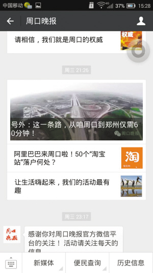 《周口晚报》副总编辑、《周口晚报》官方微信平台负责人刘杰表示,《周口晚报》官方微信平台近期将组织大量活动、派发大量礼品、发布大量有价值的新闻,使其成为市民最可靠的信息阅读平台和生活服务平台。