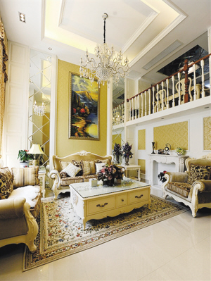 客厅白顶和黄色暖墙的搭配浑然天成,颜色与材质相呼应的家具、墙面和地面。客厅沙发墙上的一幅油画,使整体设计更显奢华,在背景墙面还采用了菱形镜面的设计,折射的光线让客厅大气华丽,并不需要珠光宝气的装饰。