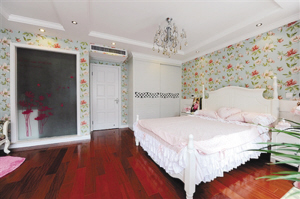 女儿房的墙壁满贴大花壁纸,清爽的蓝色底色,搭配红色和白色的花朵,给女儿房增加了甜美的气息。白色的简欧式家具与粉色床品、地毯搭配,更显粉嫩干净。女儿房里有一个卫浴空间,墙面镶嵌了磨砂玻璃,贴上红色花朵,成为卧室的一面装饰。