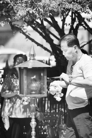 8月19日,在泰国首都曼谷,一名男子在四面佛神庙参拜。
