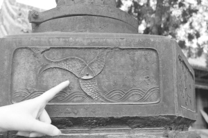 过山门,突现在眼前的是一对铁旗杆。铁旗杆高22米、重3万余斤,铁旗杆基座底座上有阳刻“喜鹊闹梅”、“白云奔鹿”、“伯乐相马”等浮雕图案,其中有一“三鱼共一头”图案,它是周口地域的形象描绘,喻指了周口是三川交汇,是沙河、颍河、贾鲁河三河交汇之地。