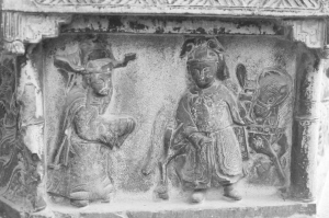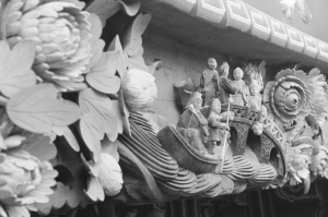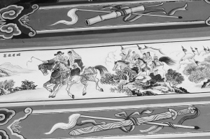 走进周口关帝庙,宛若走进石雕艺术的碑廊,入眼之处的石雕作品蕴蓄着丰富的文化内涵,充分表现了明清时期人们的愿望、追求、寄托和向往。为表达中庸之道,工匠创作出石刻《知足常乐》——最前面一位骑着一匹高头大马,手持马鞭,洋洋得意,可谓是“春风得意马蹄疾”;中间一人则跨坐在一头毛驴上,神情自若,悠然自得;而最后是一位肩负雨伞和行囊的旅人,他正大步流星向前急行。这就是人们常说的“人家骑马咱骑驴,后面还有步行的”。这是教育人们要满足现状,安于平淡,对现代人来说就是要在现今物欲横流,充满诱惑的社会中,保持良好心态,知足常乐。这种对形象事物的转借,是我国传统民间艺术中常用的象征手法。