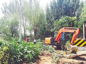 8月22日10时,记者在大庆路桥北西侧的滨河路上看到,市园林处的工作人员在平整场地、清除杂草、移栽苗木。