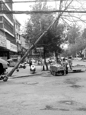 当日13时许,周口晚报记者在现场看到,一颗枯树斜歪在电线上,而树下就有几名摆摊的商贩(如图)。附近居民王先生说:“这天看着要下雨了,树就这样倒在电线上,真是太危险了。”