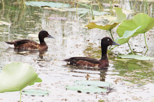 李先生是一名摄影爱好者,他介绍,当时发现它们时,水鸟栖息在芦苇和荷花丛中,偶尔啄些小鱼、小虾吃。这两只鸟体型和家养的鸭子相似,全身黑褐色,嘴巴扁平,在水中游时身体露出水面较高,尾巴向上翘,遇到船只靠近,便慌张地迅速飞离。李先生原以为这是野鸭子,照片发在朋友圈和摄影网站后,大家说法不一,先后给出了水鸡子、黑水鸭等答案。李先生说:“期待专家和网友能来答疑解惑。”