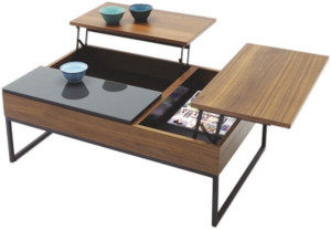 十分简约的一个茶几,其实内藏玄机:轻轻一按,滑轨弹开,内里可储物,而桌面自动分成三部分,还可根据调节高度,成为品茶空间,也可作为简易办公处。(程建兰)