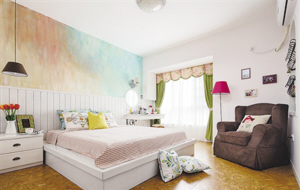 阅读沙发背后的铁艺杂志架原本是通向儿童房的阳台,后来被设计为儿童房学习区,加隔墙的时候顺便在主卧这一边做了个杂志架。墙面设计成晕染的效果,像夕阳又像大海,给人无数遐想。主卧中的卫生间被改造成衣帽间,镜面移动门后摆满了各种衣物,无论哪一个区域都井井有条。