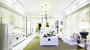 客厅的山水大理石,则更是一点也不含蓄地道出了主题。底部的深灰色线条参差交叠,仿佛远山的叠影,不规则肌理在暖白色的石面上走出了一幅天然山水画。四周的黑色线框则仿佛画框一样将它框住,它们的默契配合成就了一幅天然画作。