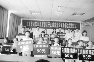 快开学啦,竟然还有奖金可拿!8月26日上午,河南亿星实业集团为考上大学、升入示范性高中以及上学年被评为三好学生的职工子女发奖,总金额近3万元。据了解,该集团职工子女教育升学奖励基金已设立4年,累计发放补贴、奖金逾77万元。 晚报记者 李伟 摄