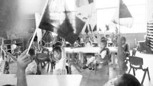 9月3日上午,商水县邓城镇张堂留守儿童学校的孩子们集体观看阅兵式电视直播,接受爱国主义教育。 晚报记者 马治卫 摄