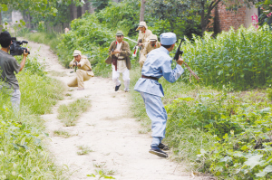 周口晚报记者在拍摄现场看到,高高的玉米地里,突然冒出几个穿着军装、佩戴着枪支和刺刀的“鬼子”,还有一个“汉奸”走在前面带路。“鬼子”的头儿看着骚乱的村民怒吼道:“‘机枪手’准备,通通地杀掉!”忽然,“机枪手”被炸,“鬼子”大乱,村民四处躲藏。“啪啪”两声枪响,两个“鬼子”倒地身亡。随后,“鬼子”的头儿也头部中枪死亡……