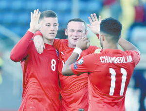 当地时间9月5日,英格兰队球员巴克利(左)进球后与队友庆祝。当日,在2016欧洲杯预选赛E组一场比赛中,英格兰队客场以6∶0大胜圣马力诺队,提前出线。新华社发