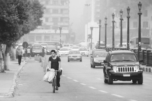 9月9日,在埃及首都开罗,一名男子在沙尘暴中骑行。
