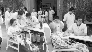 9月25日上午,周口交通广播携手爱心企业和爱心人士,为市区馨园敬老院的近百名老人送去米、面、油、月饼等物品。此外,爱心企业还组织员工为老人检查身体(如图)。晚报记者 姬慧洋 摄