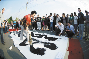 当日下午3时30分,在周口经济开发区人民广场,四张巨大的宣纸放在地毯上,几名工作人员忙着调墨、试笔,75岁高龄的周筠站在一旁指导。书写开始,周筠赤脚站在宣纸上,手持重达8公斤的大号毛笔,饱蘸调试好的墨水,气运丹田摆动手臂,随着笔尖在纸上行走,繁体“龙”字跃然纸上,引来围观市民叫好。周筠一气呵成写下“龙腾盛世”四个大字。