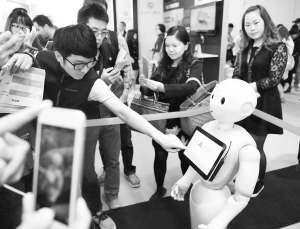 当日,由阿里巴巴、软件银行集团、富士康科技集团共同投资研发的智能机器人“Pepper”现身2015杭州云栖大会 ,吸引众多与会者的目光。据介绍,机器人“Pepper”具备“情感”,其头部装有麦克风、摄像头和3D传感器,对人的表情、声调均可识别,可根据人类情绪进行反应。新华社发