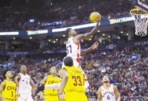 当地时间10月18日,猛龙队球员泰伦斯·罗斯(上)在比赛中上篮。当日,在2015-2016赛季NBA季前赛中,多伦多猛龙队主场以87∶81战胜克里夫兰骑士队。新华社发