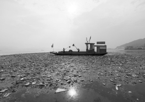 10月19日,清漂工人在三峡坝前秭归县银杏沱水域打捞漂浮物。
