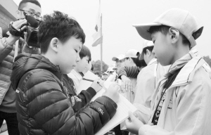 11月5日,在山东台儿庄大战纪念馆,韩国小记者为中国小记者签名留念。