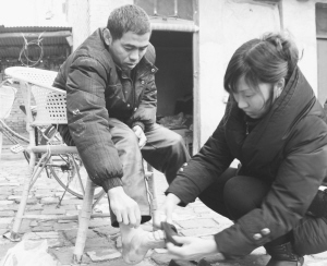 日子单调而辛苦,却让魏素梅过得越来越有盼头。东印的3个孩子一天天长大,两个女儿已能帮忙做家务,似乎苦日子就要到头了。但2012年,东印的病情突然恶化,不得不住院截肢。在医院里,除了手术前的第一个星期由侄女丹丹照顾,剩下的20多天都是魏素梅陪护。“女儿还没出门,照顾小叔不方便,弟媳又不回来,书印还有工作,就只有我来了。”魏素梅说得很轻松,做起来却相当不易。因为床位紧张,20多天里魏素梅不是睡在病房地上就是睡在走廊里;为了节省花费,她每天吃饭只花两元钱,却天天保证东印吃一个6元钱的鸡腿;给东印擦身子,腥臭味让书印都不愿近前;给东印倒尿壶,有时一晚上都得起来好几次……
