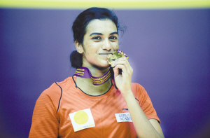 11月29日,印度选手辛德胡亲吻冠军奖牌。当日,在澳门塔石体育馆举行的澳门格兰披治羽毛球黄金大奖赛女单决赛中,印度选手辛德胡以2∶1战胜日本选手三谷美菜津,夺得冠军。