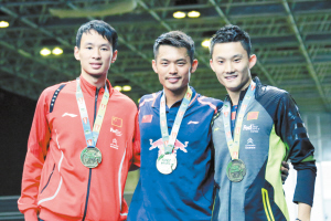 中国选手林丹(中)与获得季军的郭凯(左)和朱思远在领奖台上合影