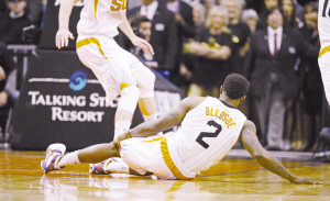 图为12月26日,太阳队球员布莱索(右)在2015~2016赛季NBA常规赛对阵费城76人的比赛中受伤后倒地。
