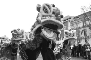 1月1日,在法国巴黎,来自巴黎华埠的谢卓贤金龙醒狮武术队在香榭丽舍大街表演舞狮。
