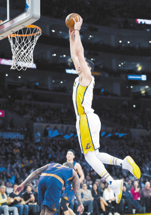 当地时间1月3日,湖人队球员拉里·南斯(上)在比赛中上篮。当日,在2015~2016赛季NBA常规赛中,洛杉矶湖人队主场以97∶77战胜菲尼克斯太阳队。