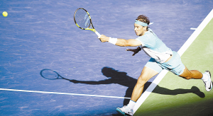 当地时间3月15日,纳达尔在比赛中回球。当日,在美国印第安维尔斯举行的巴黎银行网球公开赛男单第三轮比赛中,西班牙选手纳达尔以2∶0战胜同胞费尔南多·沃达斯科,进入16强。