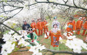 连日来,广西桂林灌阳县灌阳镇大仁村的万亩梨花绽放,当地的几支民间桂剧团队相聚梨园中,与花为伴,唱响春天。新华社发
