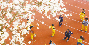 3月22日,北京市怀柔区第二小学学生在校园内盛开的玉兰花下玩耍。