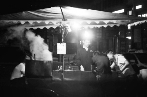 街道两侧的商店都已打烊,没有了嘈杂的吆喝声。在路口,摆地摊的小贩仍在坚守,不时有顾客光临。