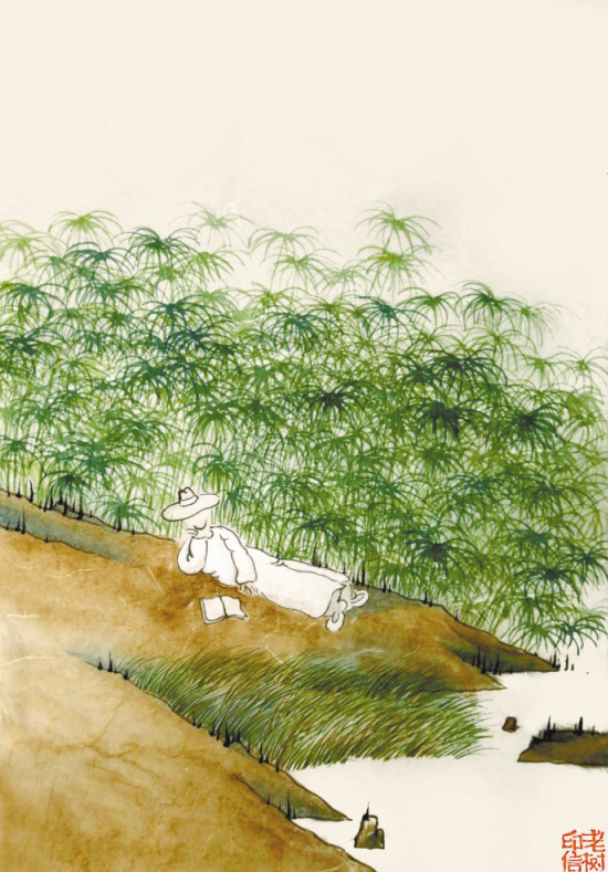 闲书似看非看,俗身半倚半躺。 听着春水流去,不禁胡思乱想。 老树画画
