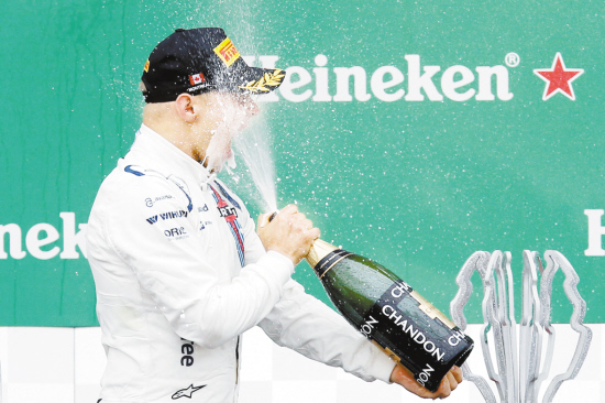 F1加拿大站 汉密尔顿夺冠 当地时间6月12日,汉密尔顿在颁奖仪式上喷洒香槟庆祝胜利。当日,F1加拿大大奖赛在蒙特利尔赛道进行,梅赛德斯车队英国车手汉密尔顿以1小时31分05秒296的成绩夺冠。新华社发