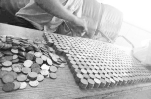 董先生说:“家里有很多1元、5角的零钱,花起来很发愁,到银行存也很难。今天来买车,我就带了其中一部分。”