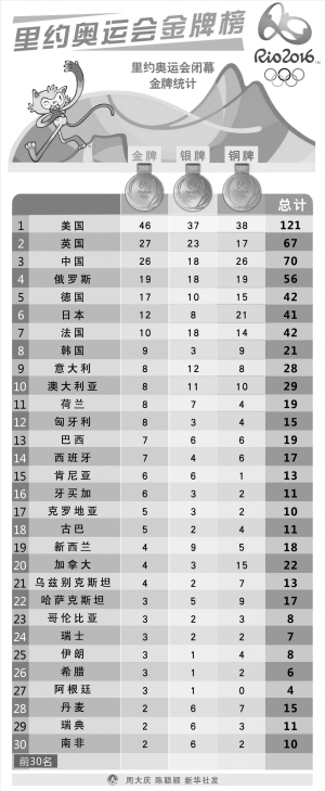 自1996年亚特兰大奥运会以来,美国几乎稳定占据了奥运会金牌榜榜首位置(2008年奥运会除外),里约奥运会也不例外,美国依然以46金37银38铜一枝独秀。但是,亚军和季军的位置发生了变化。自2004年雅典奥运会中国初登金牌榜亚军宝座后,从未掉出前二,甚至在北京奥运会荣登榜首。但在里约,英国以27金23银17铜跃居第二,中国以26金18银26铜名列第三。