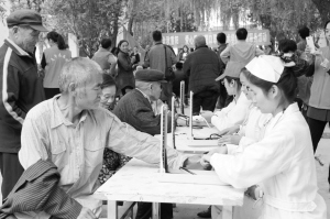 10月9日上午,团市委组织青年志愿者来到商水县平店乡敬老院,为老人表演节目、检查身体,还帮老人煮水饺。晚报记者 王凯 摄