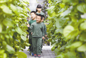 10月19日,在河北广宗智慧农业创意园的温室大棚内,小朋友在观察蔬菜的生长情况。