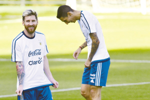 当地时间11月8日,阿根廷球员梅西(左)与队友迪马利亚在训练中。当日,阿根廷队在巴西米纳斯吉拉斯州的一处训练基地进行训练,备战将于10日进行的对阵巴西队的世界杯预选赛。